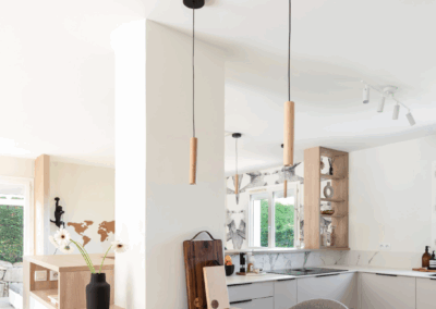 Nous avons relevé ces défis en créant une nouvelle circulation et une luminosité optimale au sein des murs existants. La cuisine a été ouverte, devenant le cœur de la maison, un espace où cuisiner et partager des moments ensemble. Un coin bureau a été aménagé pour leur fils, favorisant la concentration tout en restant connecté aux espaces de vie. Le hall d’entrée a été repensé pour maximiser le rangement et apporter de l’ordre au quotidien familial. Enfin, une nouvelle atmosphère a été instaurée grâce à des tons doux, des lignes modernes et un mélange harmonieux de fonctionnalité et de confort — transformant la maison en un foyer rafraîchi et accueillant.