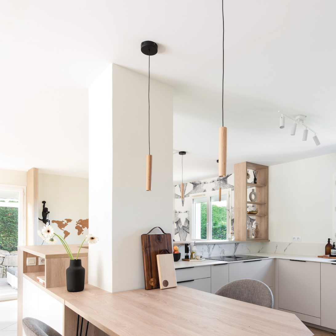 La cuisine ouverte est désormais un espace lumineux et accueillant où toute la famille se retrouve. Le coin bureau intégré répond parfaitement aux besoins de leur fils, sans empiéter sur le salon. L’entrée repensée facilite le rangement et le quotidien.